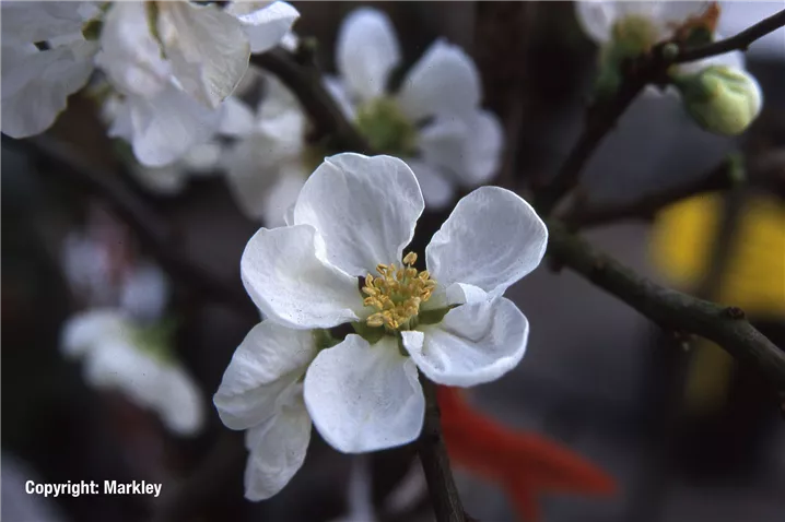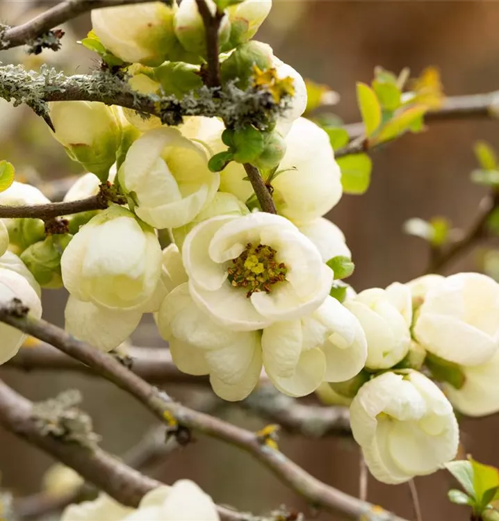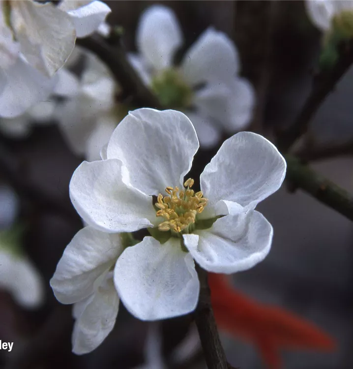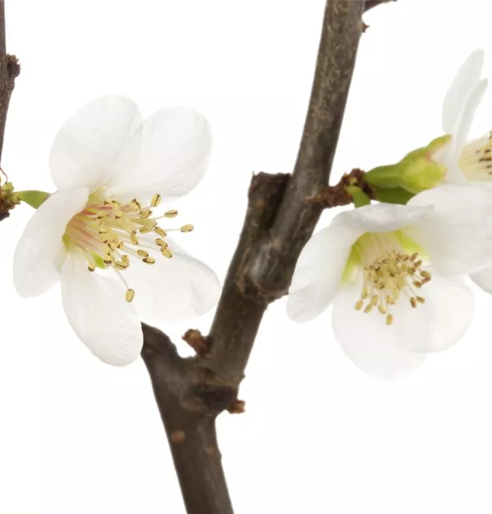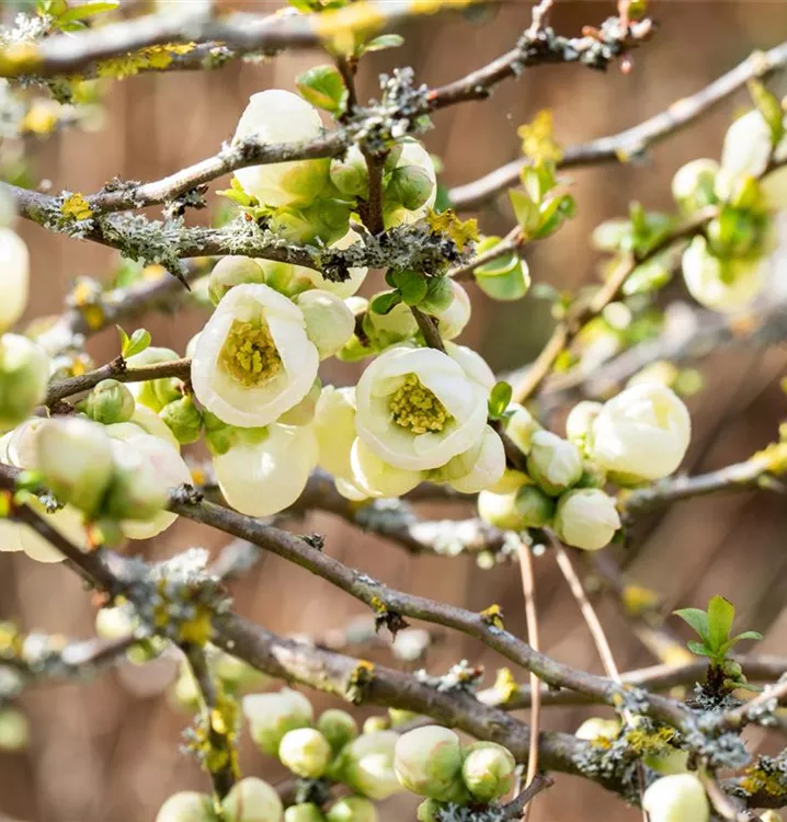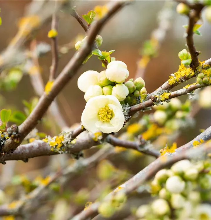 Chaenomeles x superba 'Jet Trail' bringt weiße Blüten von April bis Mai hervor.