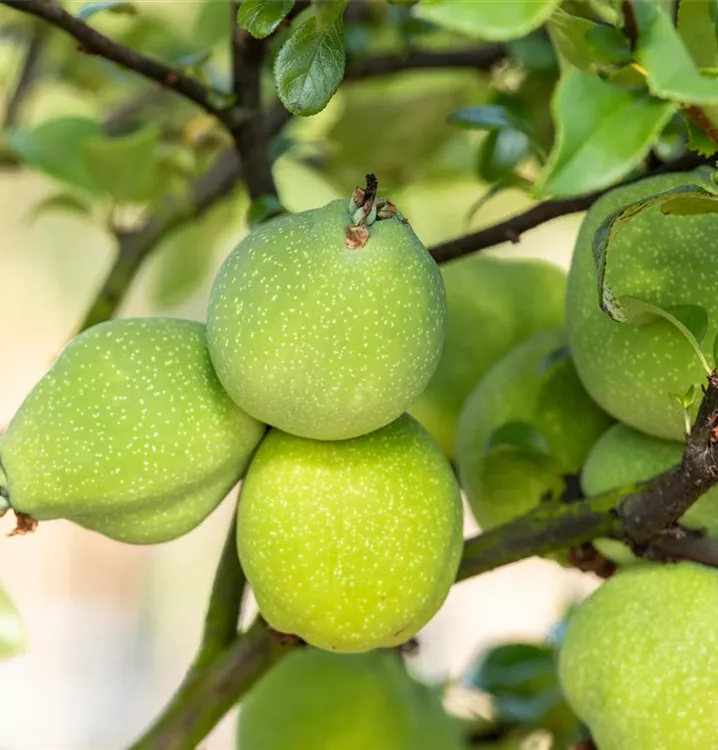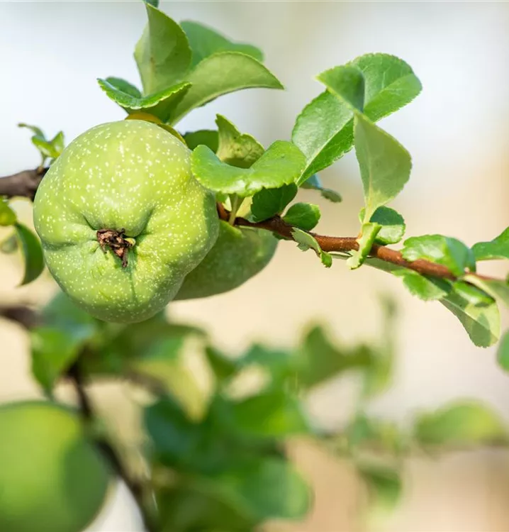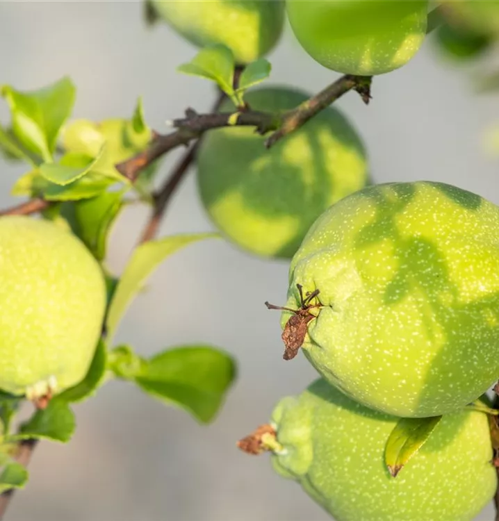 Die birnenförmigen Kernfrüchte der Zierquitte 'Jet Trail' duften und sind gelb-grün.